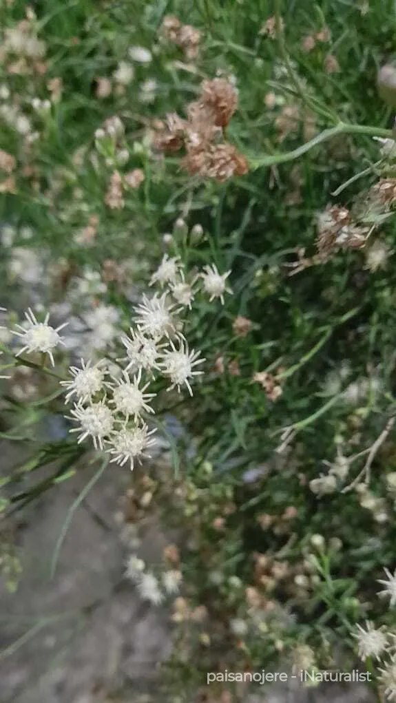 🌱 Descripción general: Plantas herbáceas de entre 10 y 30 cm de alto, muy ramificadas en la base, sin tallos principales definidos. Sus tallos son delgados, flexibles y cubiertos de pelitos glandulares, que crecen de manera ascendente o recta. Sus hojas son muy delgadas y alargadas, parecidas a hilos finos, con bordes enteros o ligeramente dentados y una punta aguda. Produce flores pequeñas (masculinas y femeninas) agrupadas en racimos densos y ramificados en las puntas de las ramas. Sus frutos son aquenios pequeños cubiertos de pelitos.