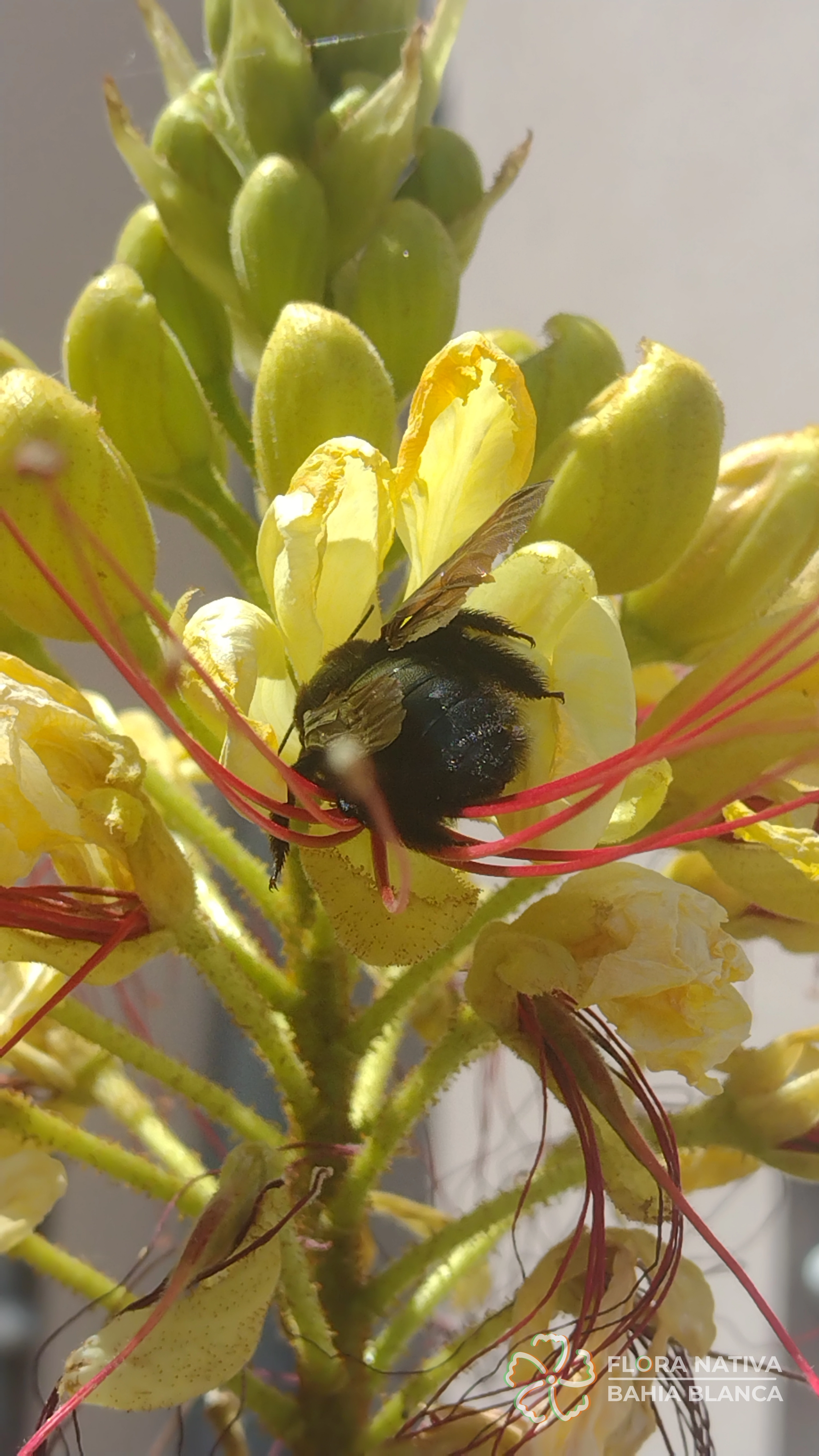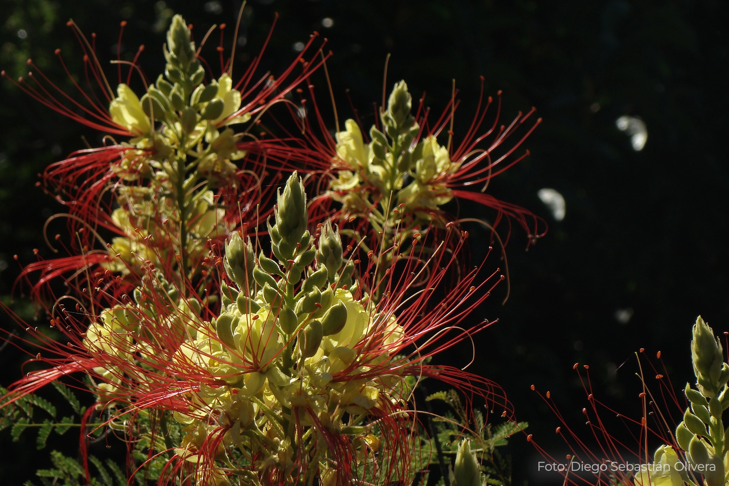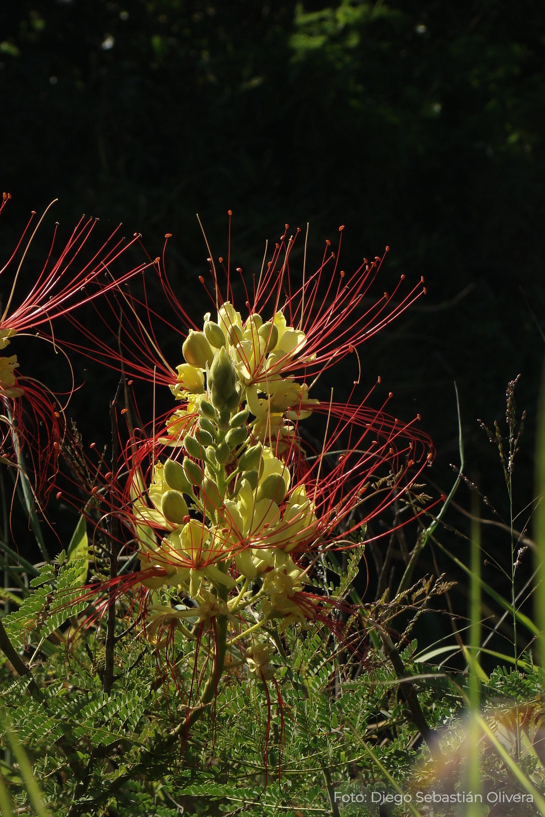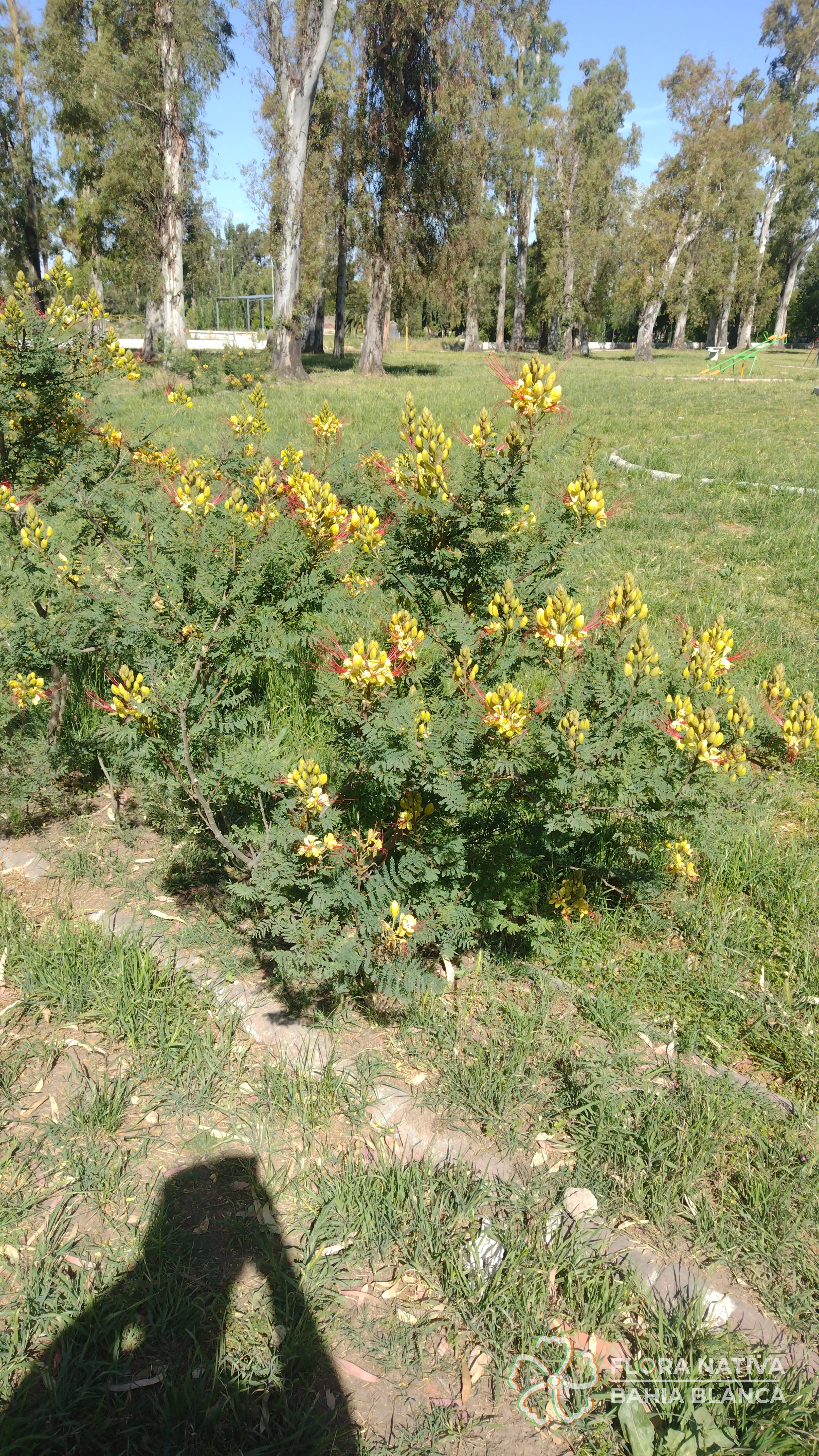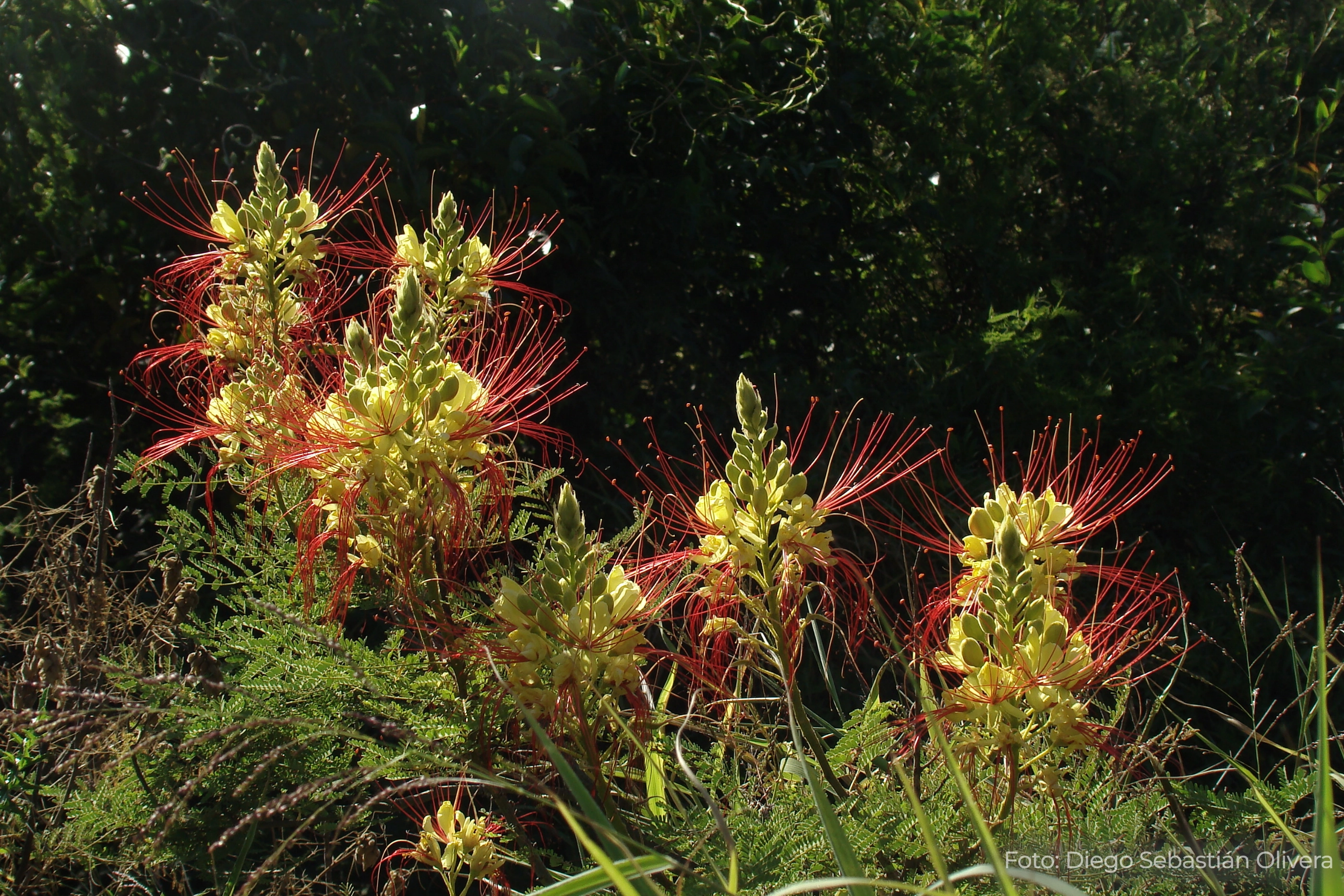 🌱 Descripción general: Arbusto de porte erguido que puede alcanzar entre 0,8 y 3 metros de altura. Las ramas poseen pelos finos y suaves, con glándulas que al tocarlas emanan un olor fuerte. Sus hojas son grandes, compuestas por muchos folíolos. Las flores de pétalos amarillos y largos estambres rojizos, muy vistosas, se disponen agrupadas en inflorescencias terminales. El fruto es una chaucha o legumbre que contiene a las semillas comprimidas, redondeadas, con manchas color oliváceo a castaño. Una vez maduro libera las semillas de forma explosiva