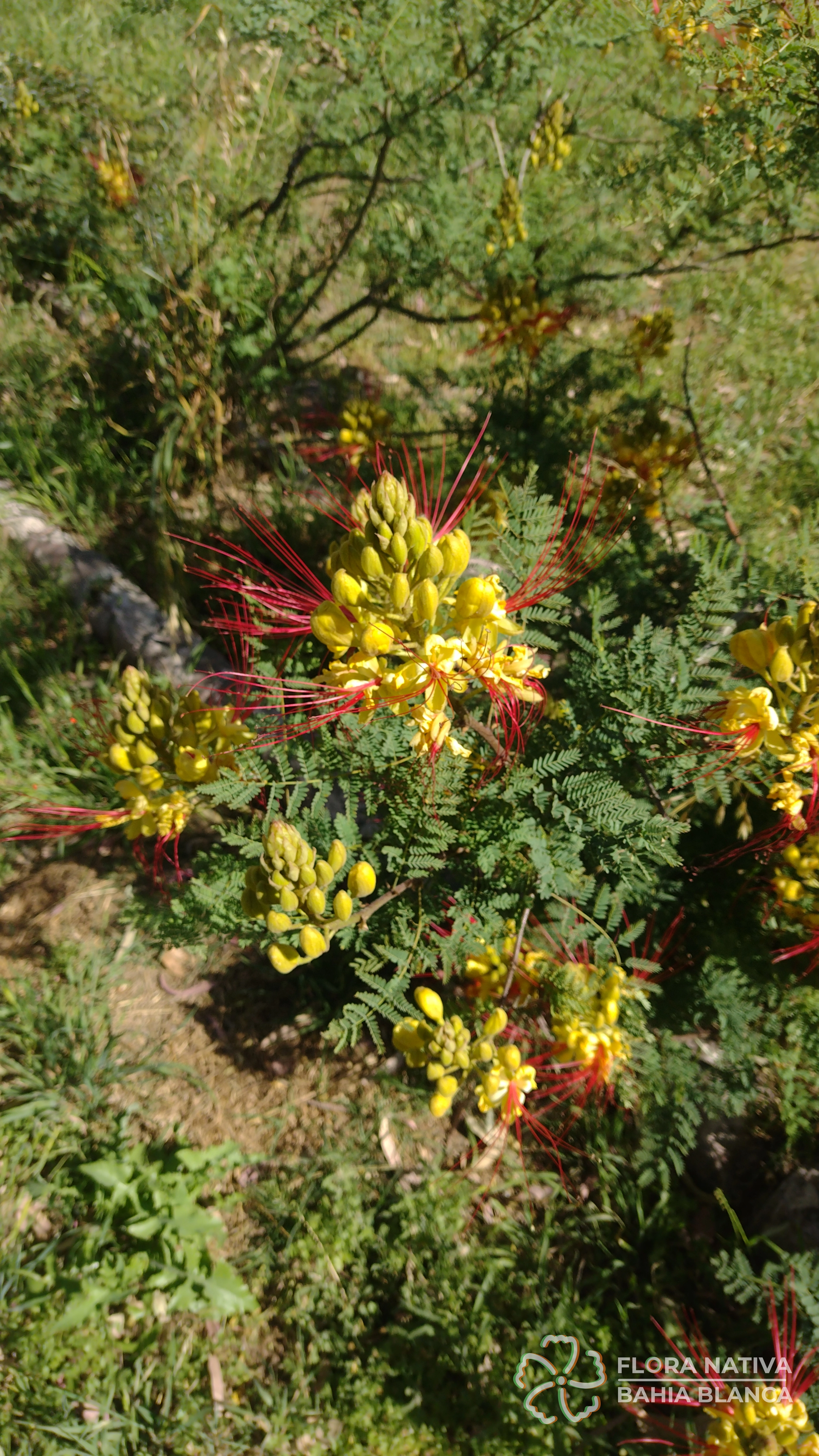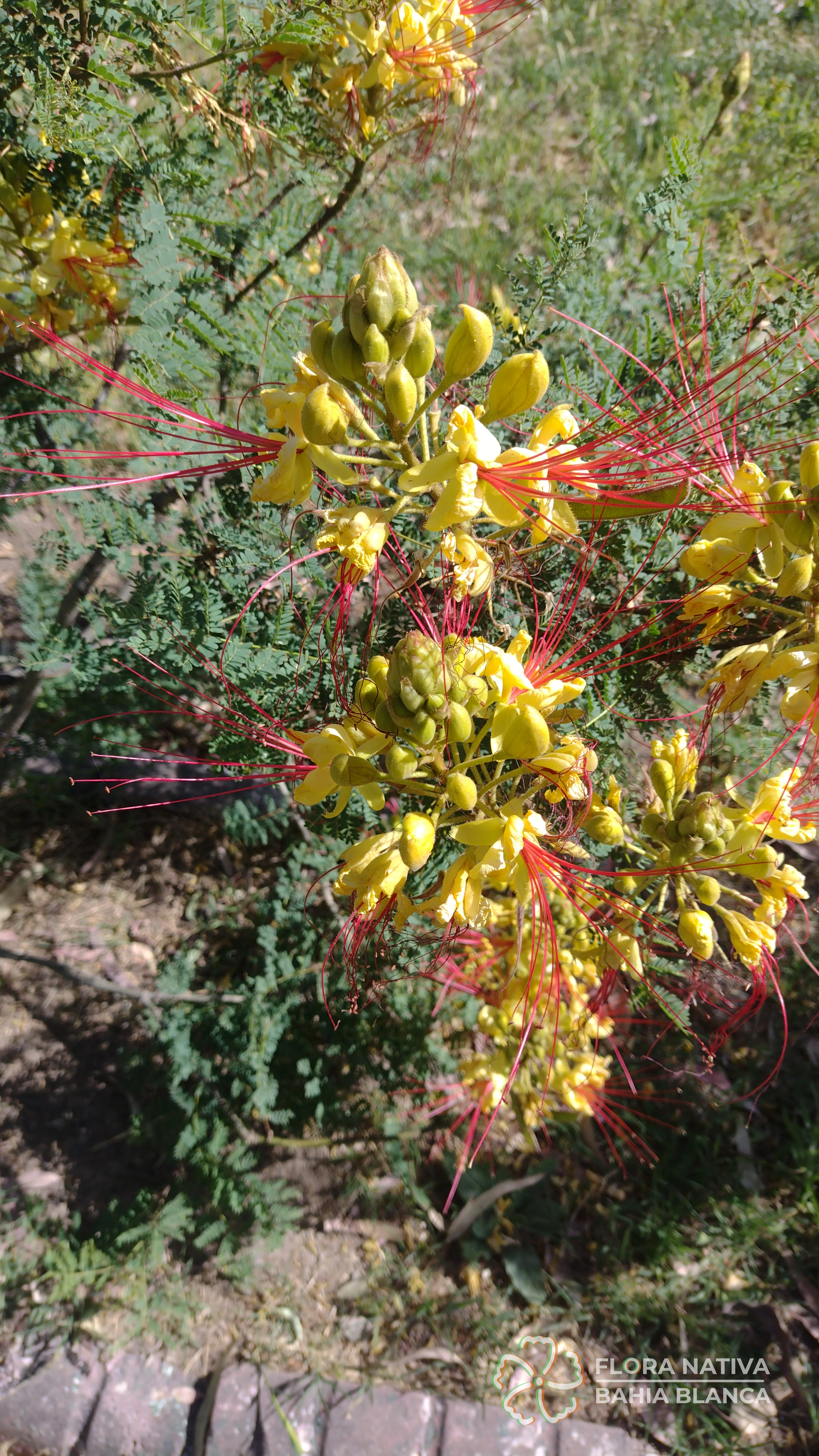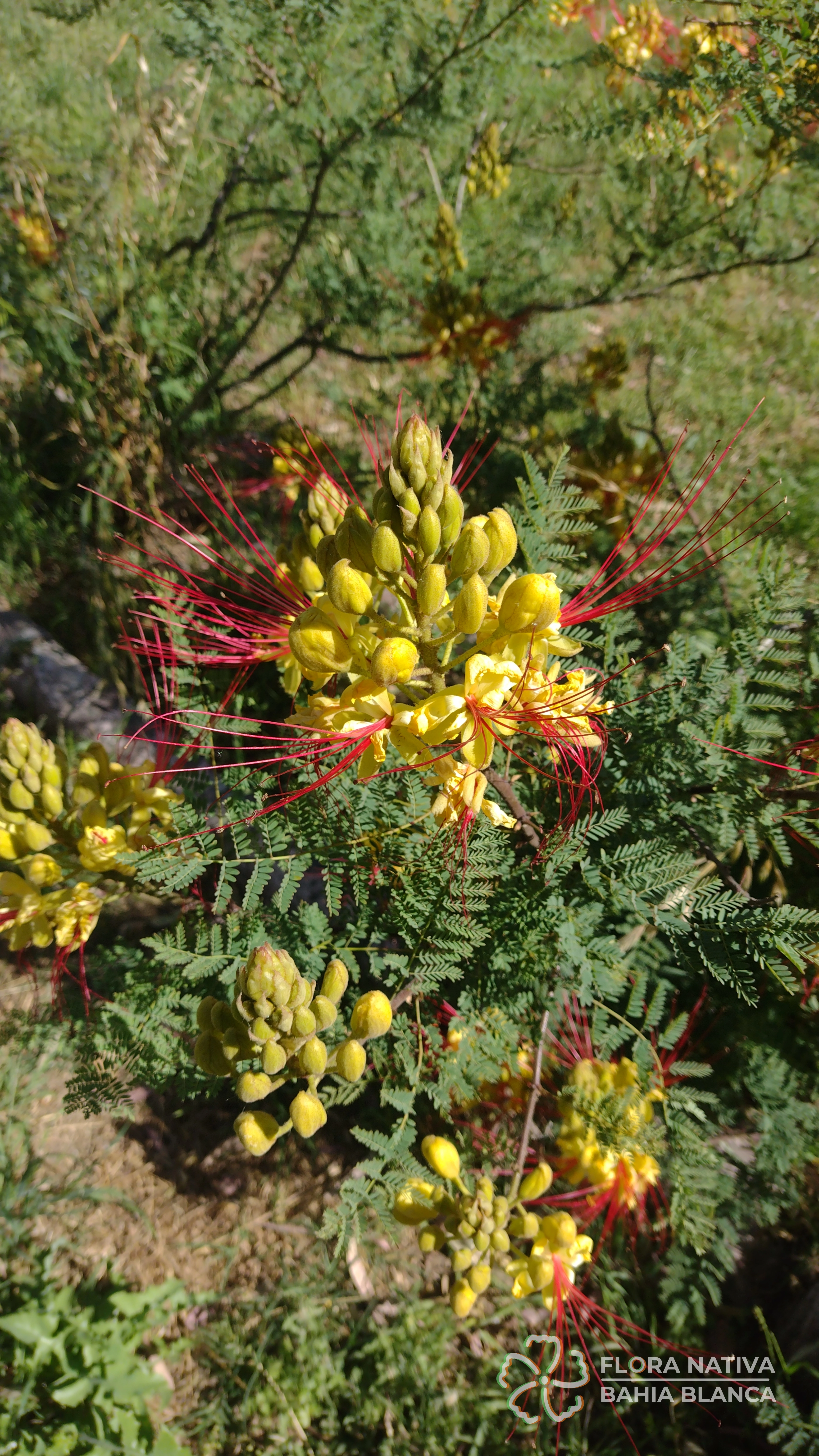 Otros nombres: Algarrobilla, algarrobillo, ave del paraíso, barba de viejo, barbón, cesalpinia, cosme, disciplinas de monjas, espina de amor, flor de seda, flor del indio, lagaña de perro, mal de ojos, payun matru (ranquel), picha de perro, piscala, poinciana (Sinónimos: Caesalpinia gilliesii)