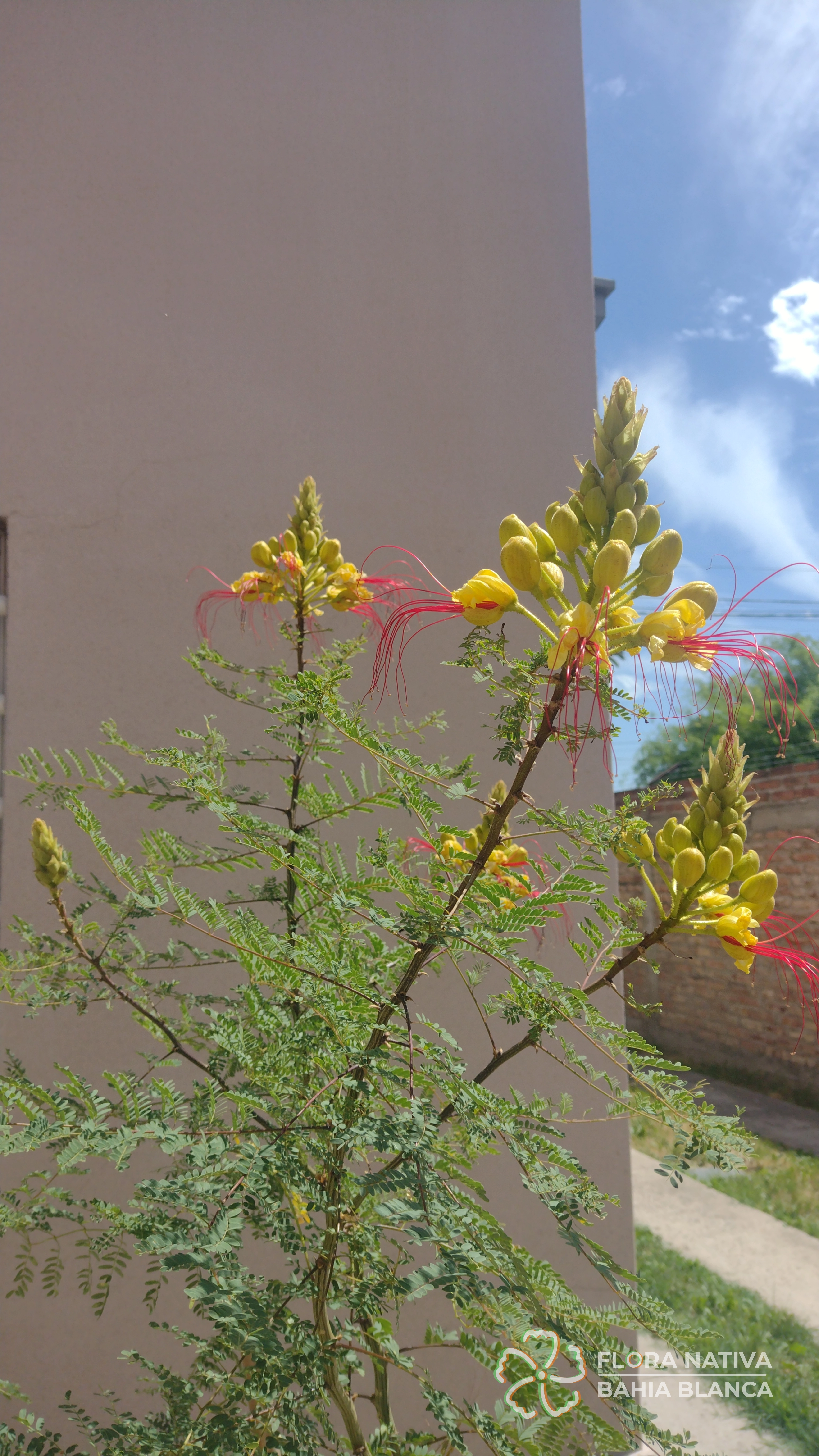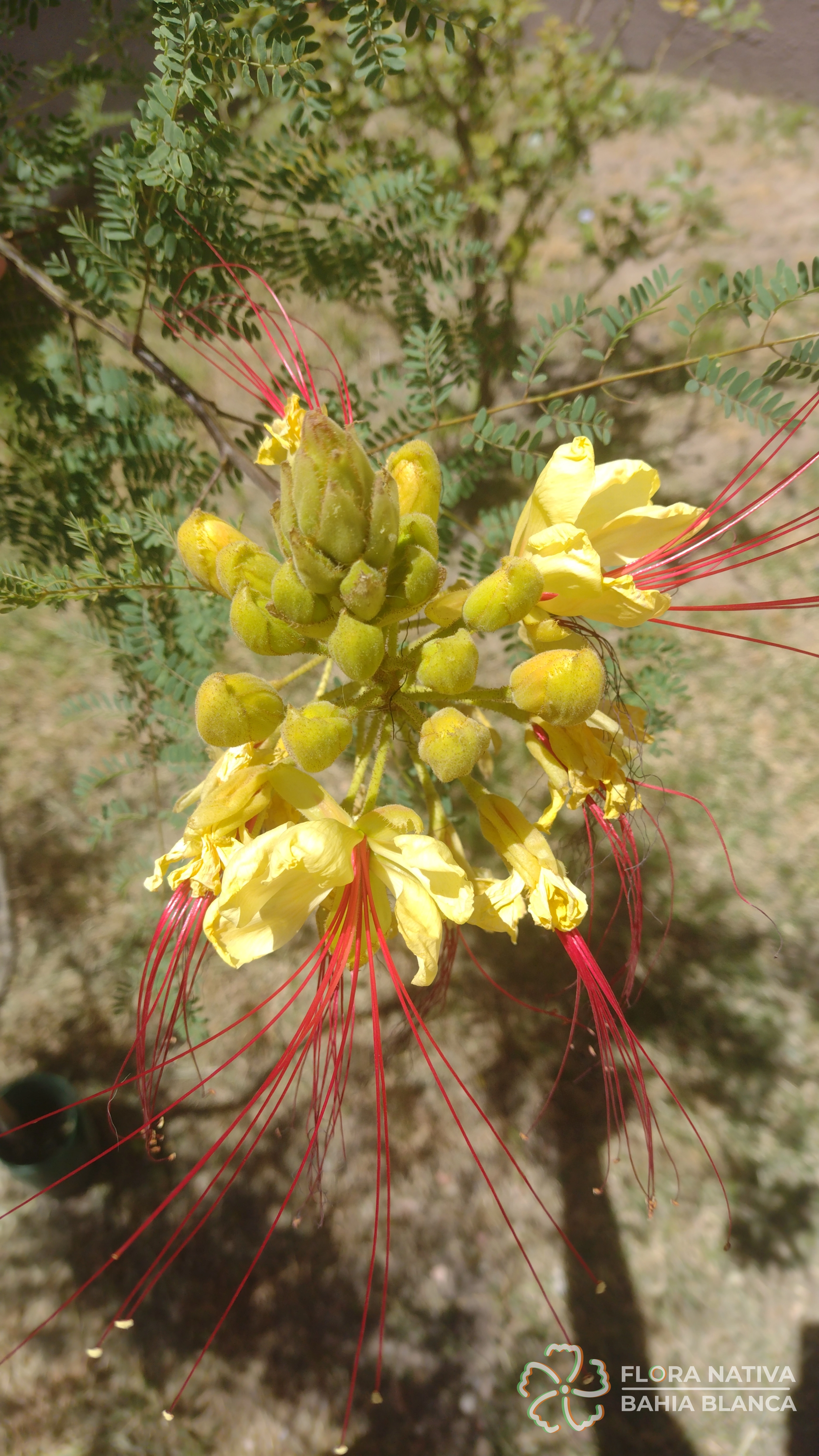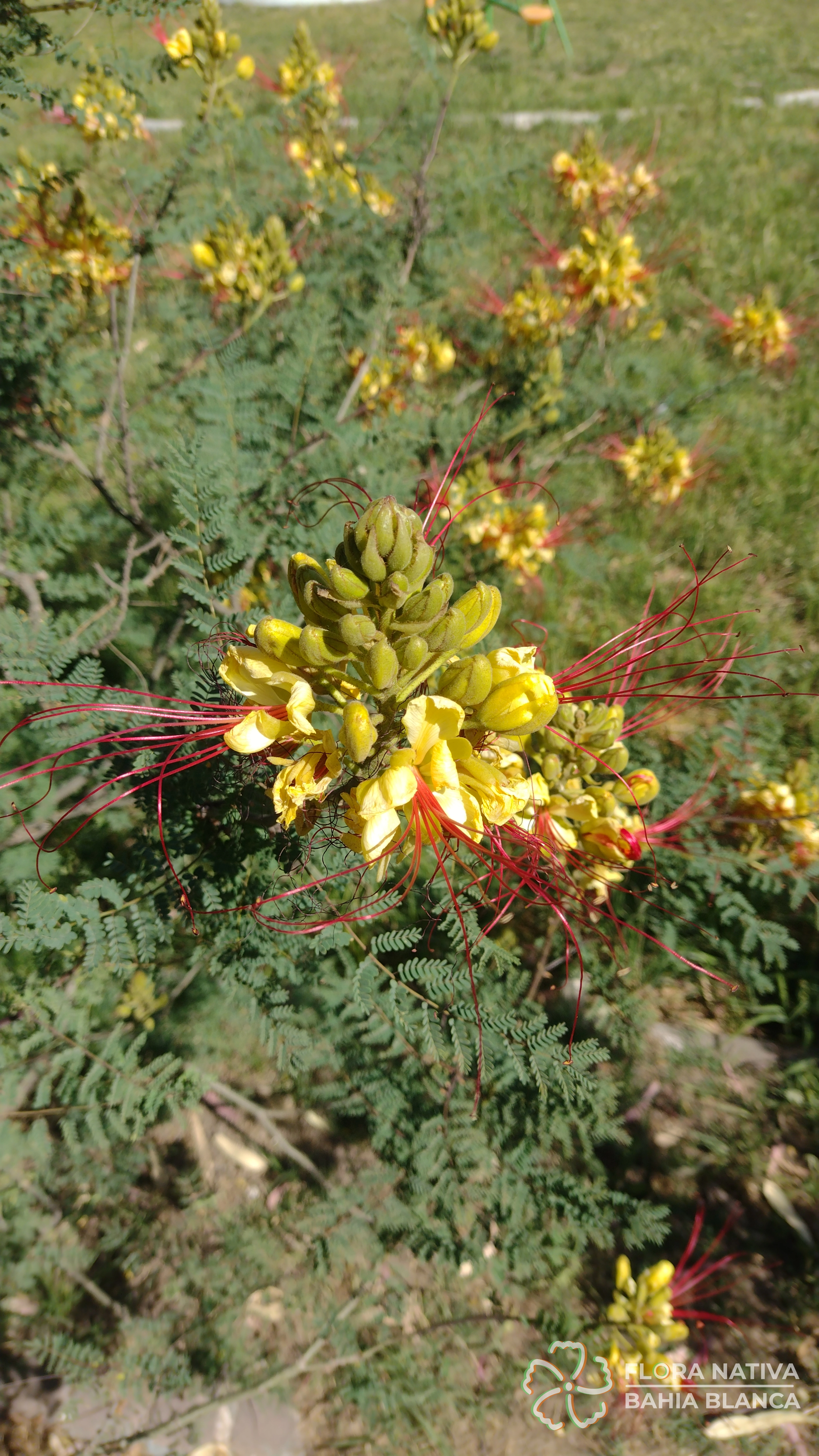 Otros nombres: Algarrobilla, algarrobillo, ave del paraíso, barba de viejo, barbón, cesalpinia, cosme, disciplinas de monjas, espina de amor, flor de seda, flor del indio, lagaña de perro, mal de ojos, payun matru (ranquel), picha de perro, piscala, poinciana (Sinónimos: Caesalpinia gilliesii)